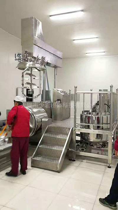 物料在水鍋、油鍋內通過加熱、攪拌進行混合反應后,由真空泵吸入乳化鍋,通過乳化鍋內上部的中心攪拌、聚四氟乙烯刮板始終迎合攪拌鍋形體,掃凈掛壁粘料,使被刮取的物料不斷產生新界面,再經過葉片的剪斷、壓縮、折疊,使其攪拌、混合而向下流往鍋體下方的均質器處,物料再通過高速旋轉的切割輪與固定的切割套之間所產生的強力的剪斷、沖擊、亂流等過程,物料在剪切縫中被切割,迅速破碎成200um-0.2um的微粒,由于乳化鍋內處于真空狀態,物料在攪拌過程中產生的氣泡被及時抽走。采用抽真空的方式,使所生產的制品在攪拌過程中不再混入氣泡,從而保證可制造出富有光澤、細膩及延展性良好的產品。